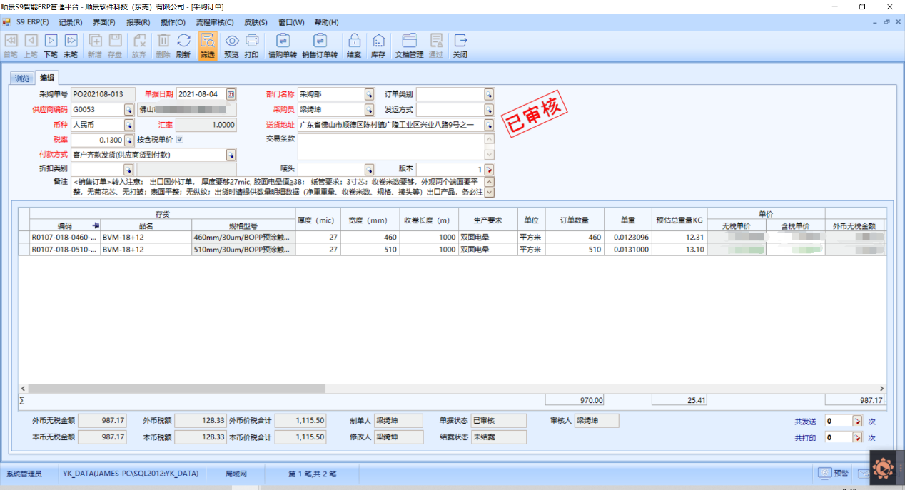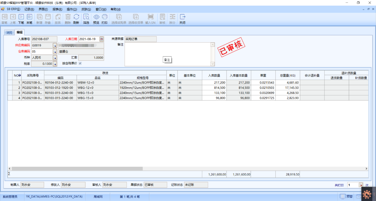 采购在接收到PMC请购需求时,可以把对应客户要求,关联至采购订单,并且采购明细有厚度、宽度、收卷长度、生产要求栏位指定,方便采购与计划以及销售的信息协同,仓库入库时多单位计量,系统不仅记录基本采购单位,还显示物料单重以及入库总重量。