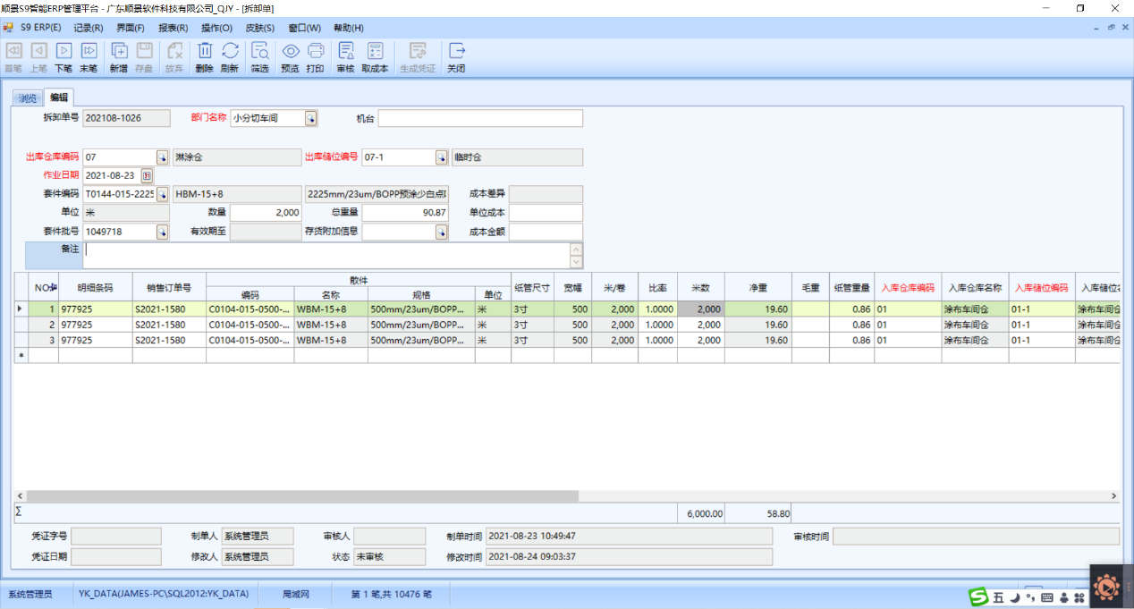 分切车间通过扫码的方式完成分切单据的录入,PMC首先会根据明天要做的销售订单产品,打印销售订单,并附带销售订单的订单条码,下发给分切车间机台的机长,机长通过拆卸单界面用扫码枪扫描条码的方式进行涂布母卷的分切。首先扫描涂布母卷标签上的料号二维码,再扫描标签上的批号二维码,系统会自动匹配涂布母卷的信息,自动带出该母卷的仓库储位及米数等信息。成品分切后,机长会在拆卸单子表订单条码栏位扫描订单条码,确定分切的是哪张销售订单的产品,扫描订单条码后,系统会自动匹配销售订单的信息,并自动生成成品的批次号,机长每分切完一卷都会修改填写该卷膜的实际重量及米数,下卷膜分切完后会重复此操作,分切完后也会贴上成品膜标签。